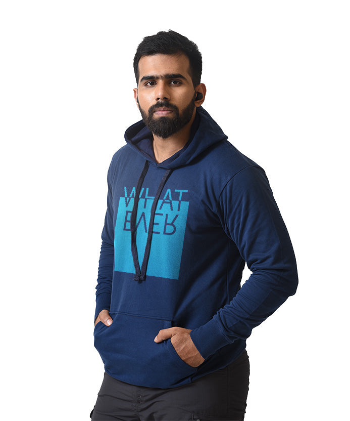 Navy Blue Hoodie, has a hood, both side pocket, long sleeves, straight hem.